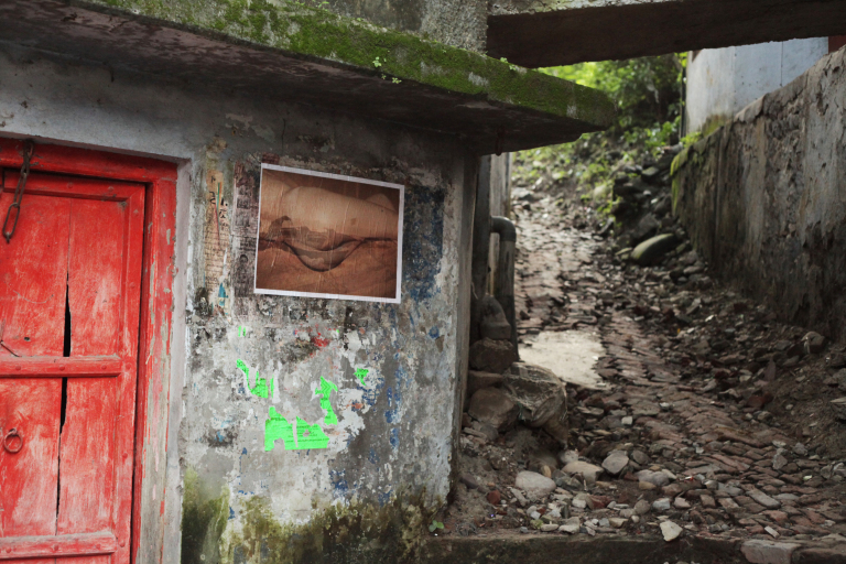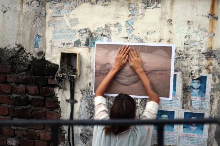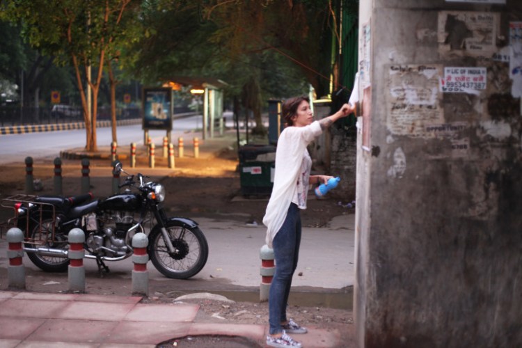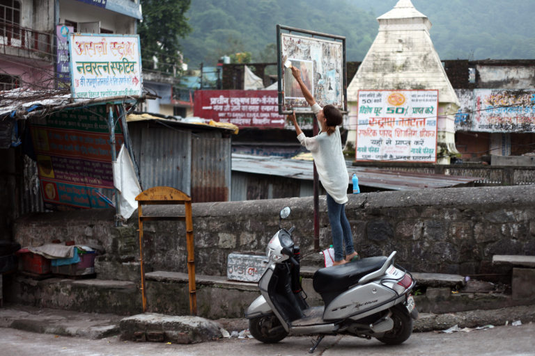 Mon idée : mélanger dans les esprits le sacré et le corps de la femme. Ces photos ont été exposées dans une galerie à Pondichéry puis j’ai décidé suite aux réactions fortes rencontrées de les imprimer sur du papier et de les afficher partout où j’aurais le temps d’aller. Les coulisses de ma crise de street art féministe ici
