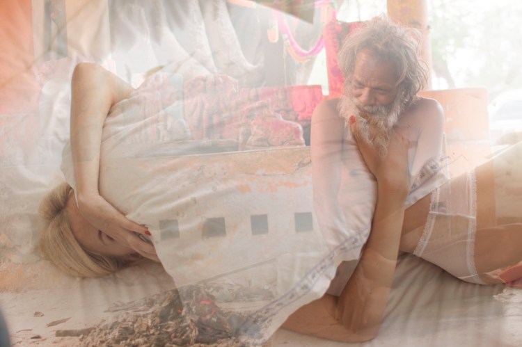 Ce sujet je l’ai déjà abordé d’une autre façon. A ma manière, lors d’un voyage en Inde. J’étais tellement choquée de la condition de la femme là bas, du nombre délirant d’agressions, un viol toutes les 18 minutes dans le sud-est – et encore ce ne sont que les chiffres officiels, que je ne pouvais rester sans rien faire. Alors j’ai repris des images shootées pour des marques de lingerie ici à Paris et je les ai superposées avec des images de lieux sacrés photographiés lors d’un autre voyage sur les bords de la Yamuna.