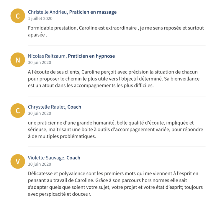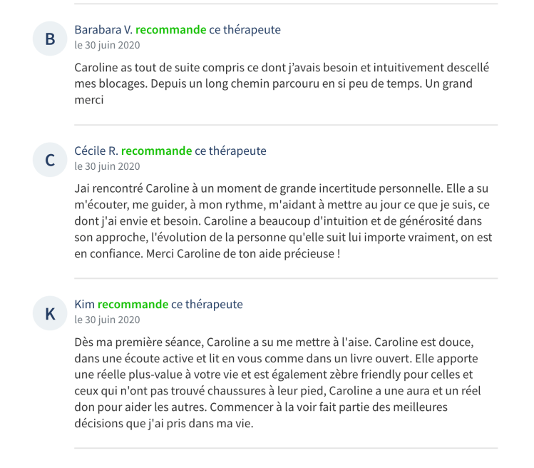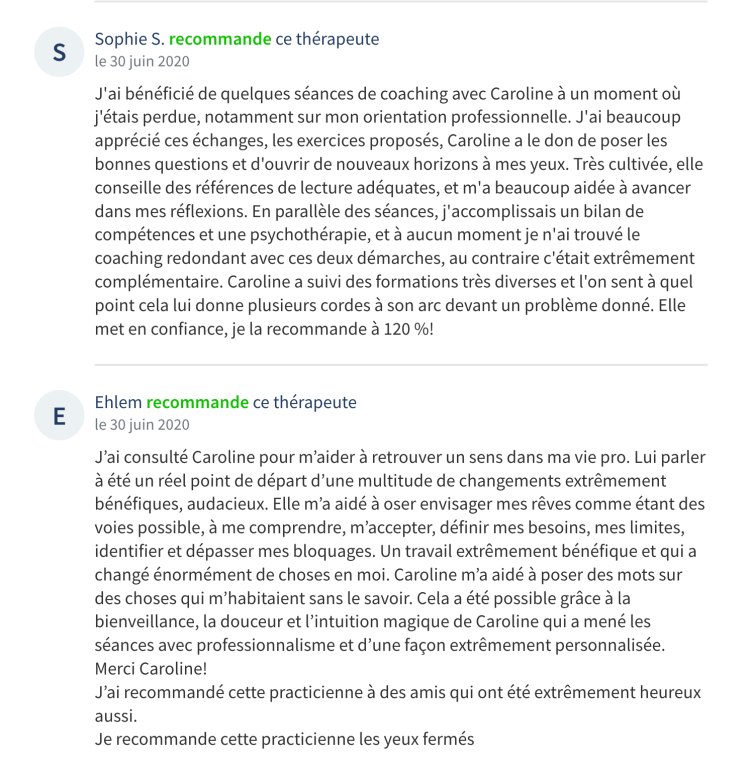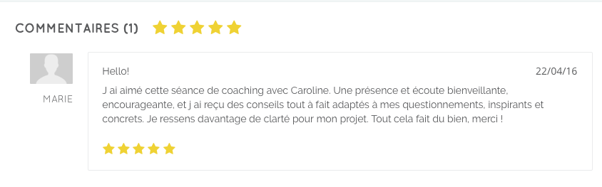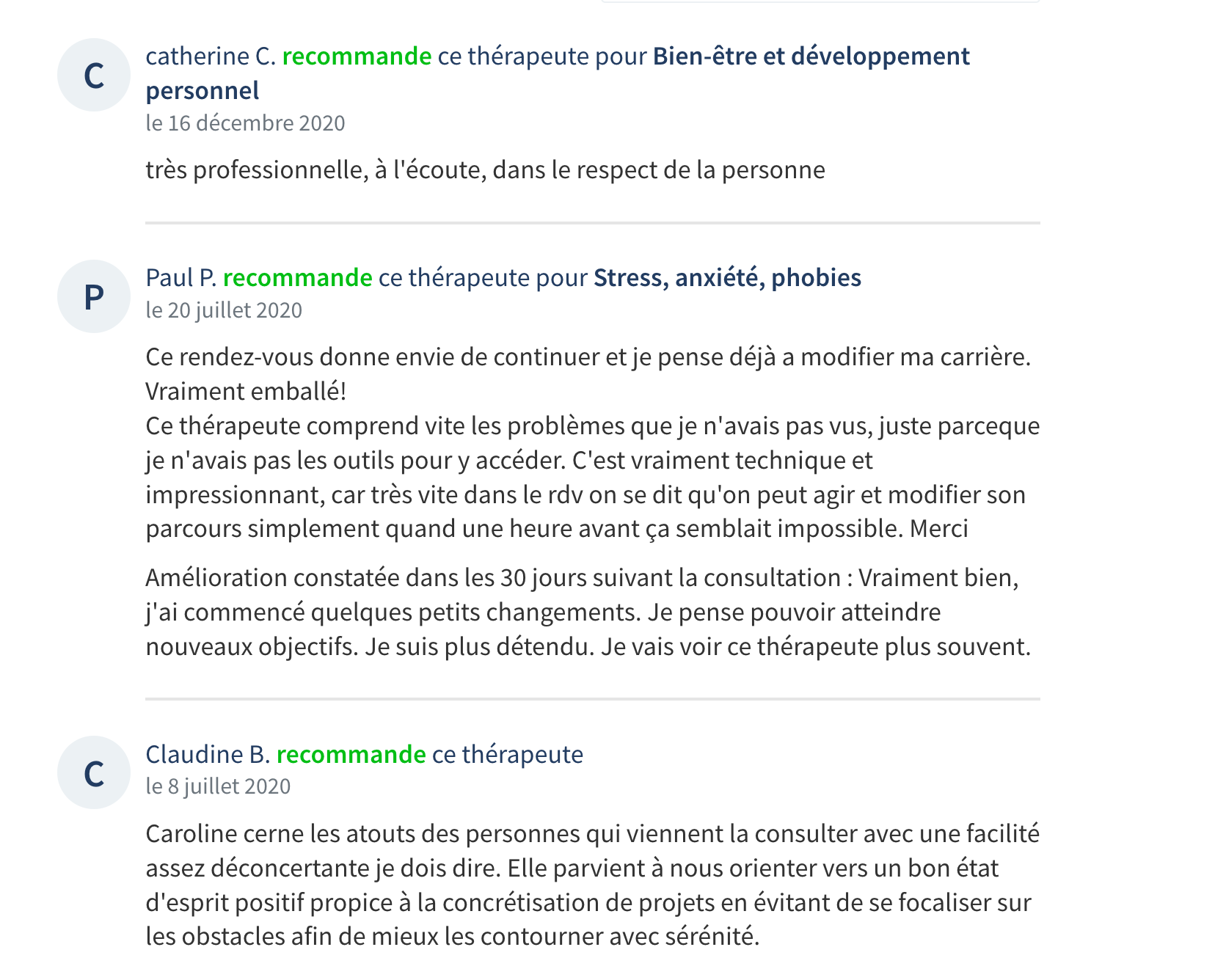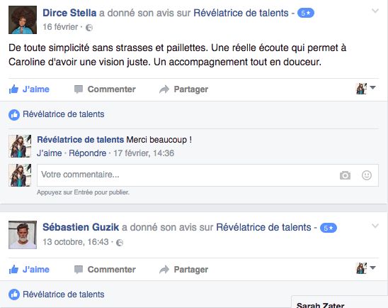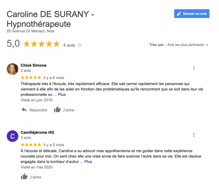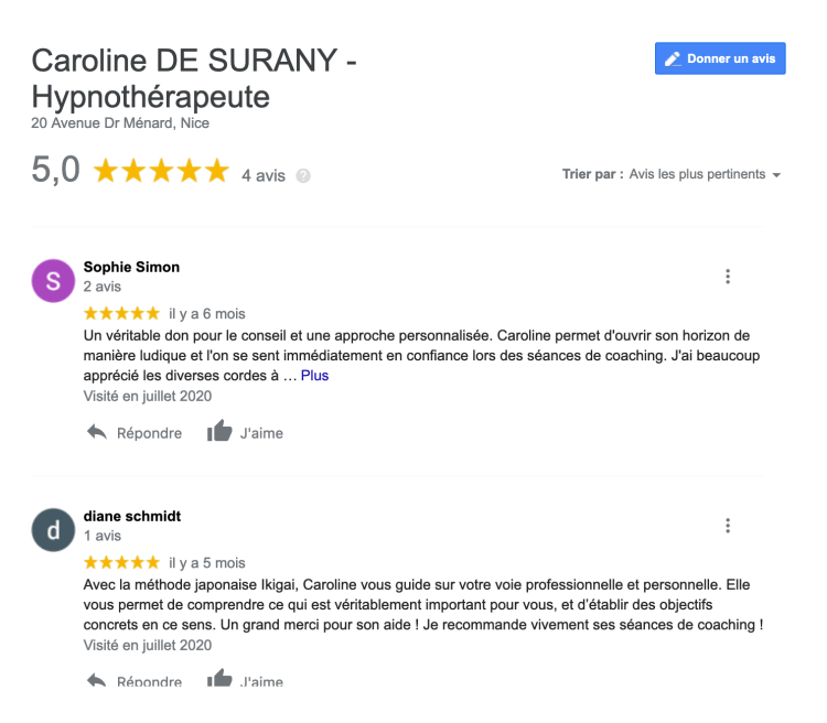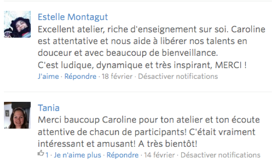 Avis Voici quelques commentaires sur mes séances d’hypnose, de coaching et mes ateliers Les avis sur d’autres plateformes : Share this: Share on X (Opens in new window) X Share on Facebook (Opens in new window) Facebook Like Loading...